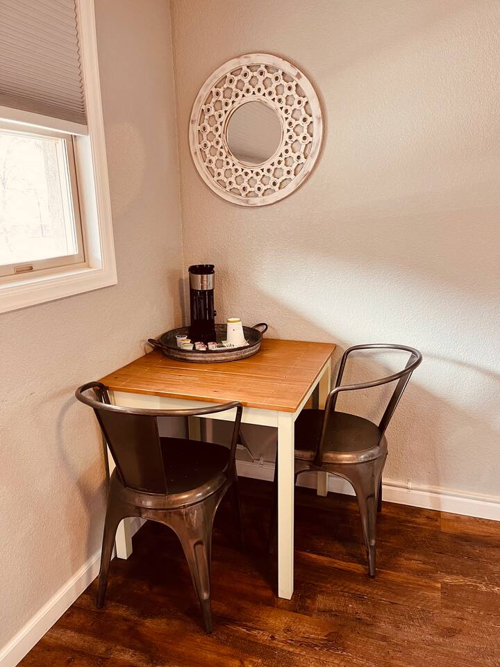 Our room #201 has recently (and lovingly) been fully renovated! We love the bright and clean vibe of our room and we hope that you'll find its design and aesthetic to your liking as well. You will definitely love the expansive and scenic views of the Rockies and the rolling foothills that surround Manitou Springs out your room's window and you'll also love being so close to downtown Manitou Springs; it's just a short walk to the heart of downtown or up to the trailhead of the famous Manitou Incline. Every room is cleaned by a company that specializes in vacation rental cleaning and we offer high quality coffee, sugar, shampoo, conditioner, soap for your enjoyment. All of our bed sheets, comforters, and towels are professionally laundered at one of Colorado Springs' best commercial laundromats.